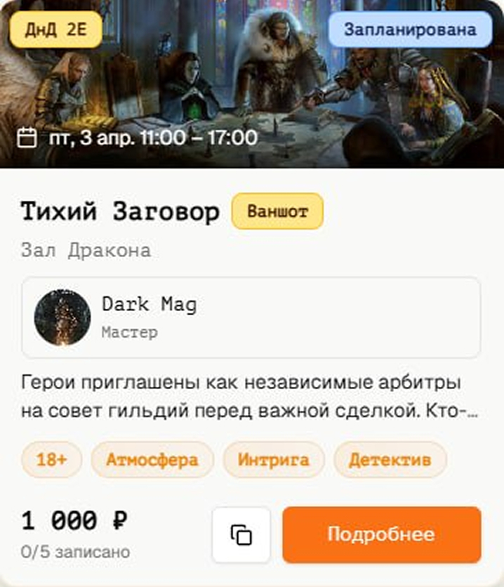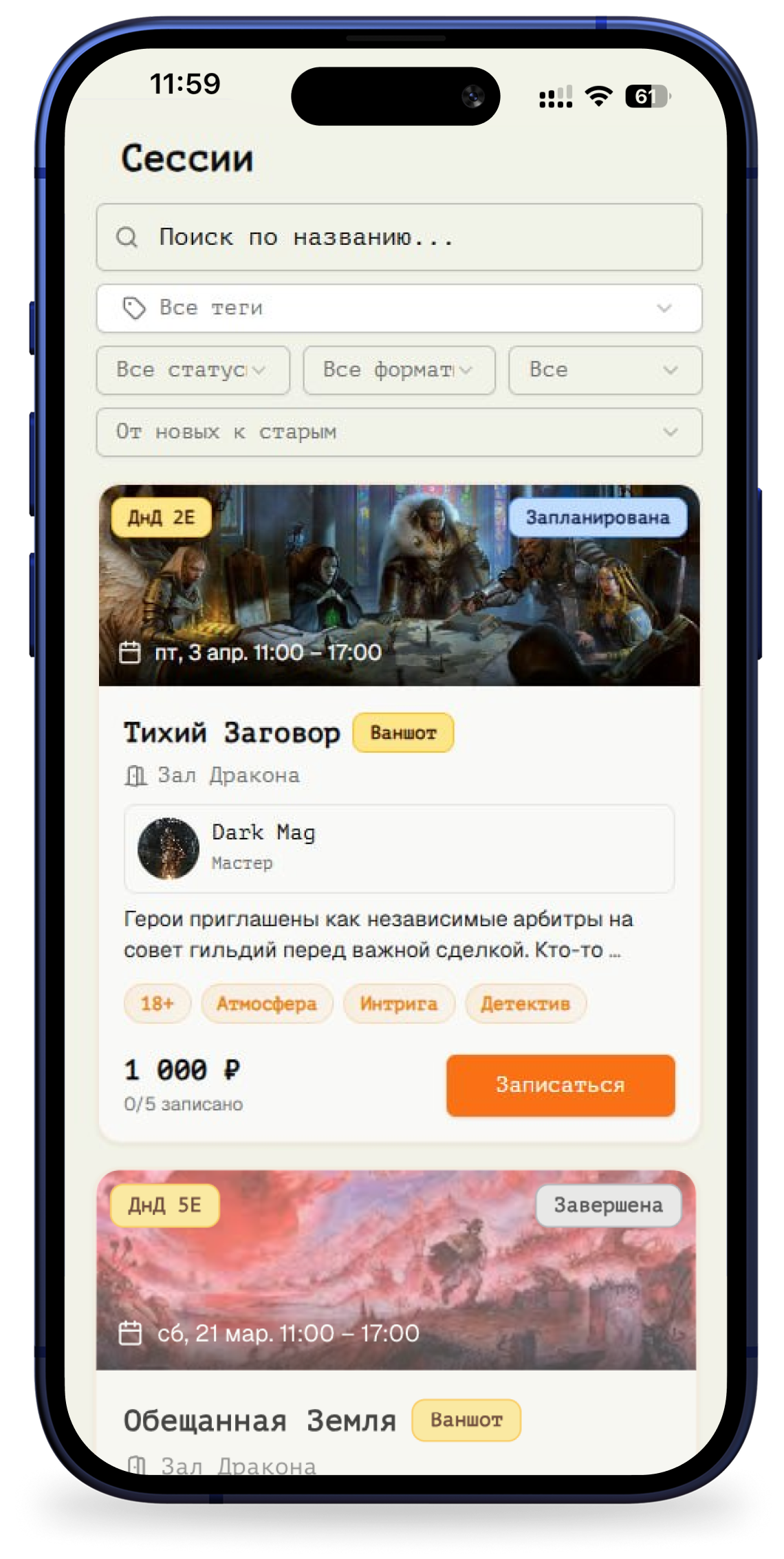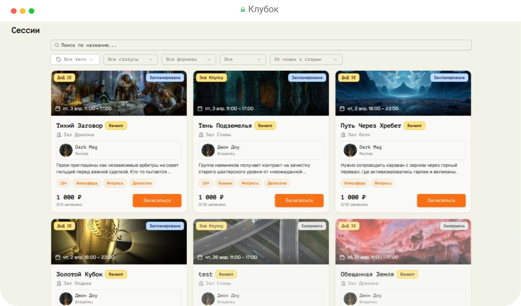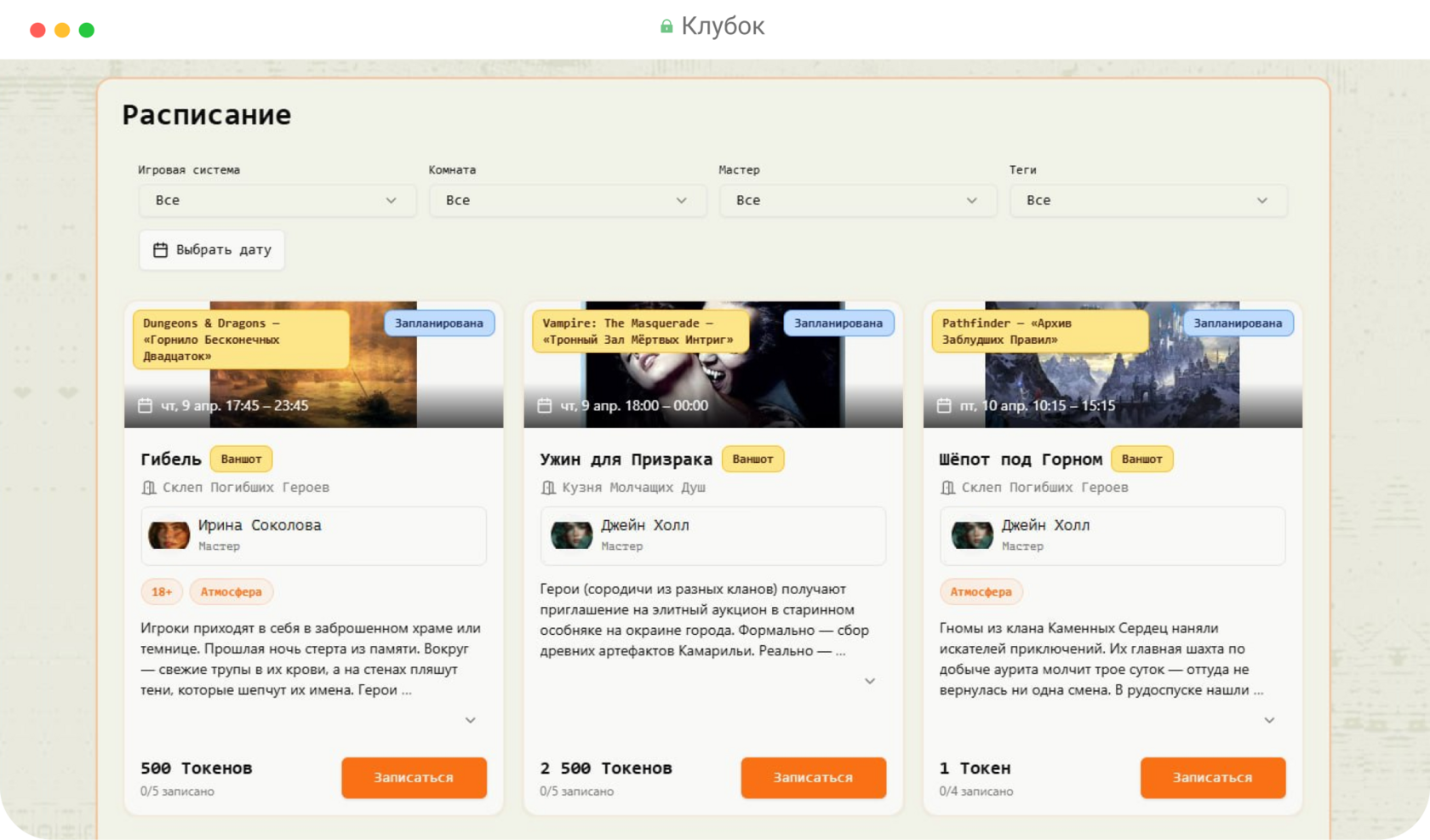 Ведите кампании, столы и игроков без таблиц и чатов. Удобная запись и управление даже при большом потоке